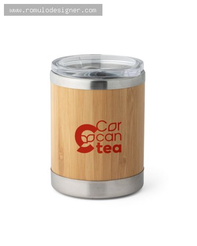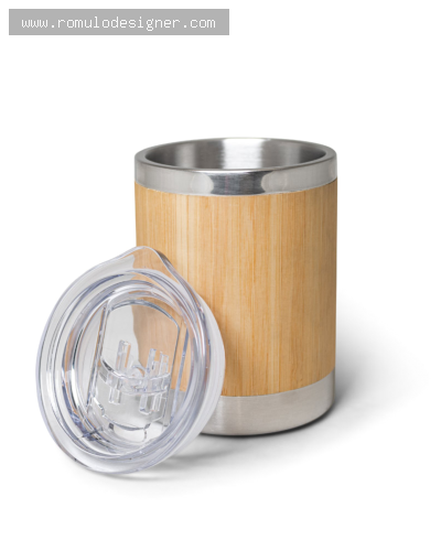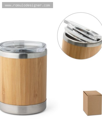 Copo de viagem em aço inox e bambu, térmico com parede dupla isolada a ar e tampa AS com fecho deslizante. Capacidade até 350 mL. Preserva as bebidas quentes por 2 horas e as bebidas frias por 4 horas. Fornecido em caixa presente de papel kraft reciclado. Certificação EU Food Grade. A cor e o resultado da impressão nos materiais naturais pode variar entre produtos. ø80 x 108 mm .