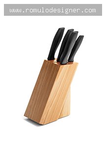 94110 - Suporte para facas em madeira de pinho. Incluso conjunto de 5 facas de cozinha: faca utilitária média, faca utilitária pequena, faca para vegetais, faca para pão e faca para carne. Peças em aço inox e PP, cabo com acabamento emborrachado. Próprio para contato com alimento.