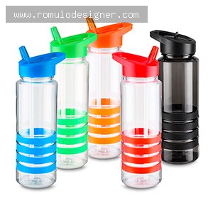 Garrafa plástica com capacidade de até 700 ml, com apoio de mão emborrachado e canudo. Tampa rosqueável com anel de silicone para vedação, plástico utilizado AS (estireno de acrilonitrilo).