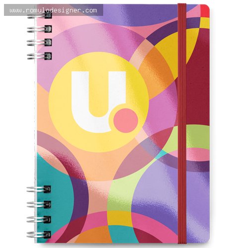 Caderno Fotolux laminação brilho, impressão 04 cores na capa e contra capa (área total), capa dura com cantos arredondados, fechamento em wire-o intercalado, elástico de fechamento na capa incluso 8 páginas iniciais sendo: Dados pessoais, calendário, planejamento anual e trimestral. Embalado em shrink (plástico prensado) de 05 em 05 peças.