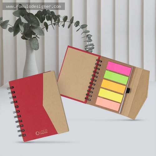 Caderno ecológico com autoadesivos e suporte para caneta. Caderneta com capa colorida e abertura lateral imantada, primeira folha com cinco blocos autoadesivos coloridos com aproximadamente 25 folhas e aproximadamente 68 folhas brancas pautadas. Ultima página kraft conta com suporte para caneta em nylon(não acompanha caneta).