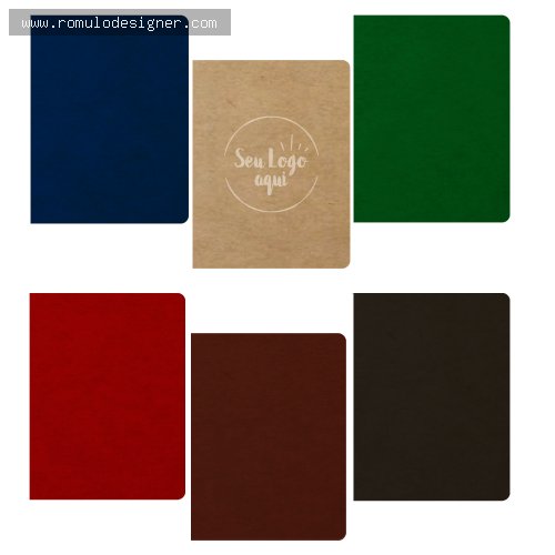 Caderno costurado com capa flexível de papel kraft colorido. 50 folhas pautadas com fechamento de costura