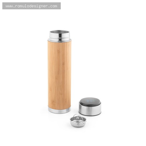 Garrafa em aço inox e bambu de parede dupla térmica, isolada a vácuo. Capacidade até 430 mL. A tampa contém um termômetro digital que permite saber, a qualquer momento, a temperatura da bebida. Inclusa pilha e infusor para chá. Certificação EU Food Grade. A cor e o resultado da impressão nos materiais naturais pode variar entre produtos. ø65 x 235 mm .