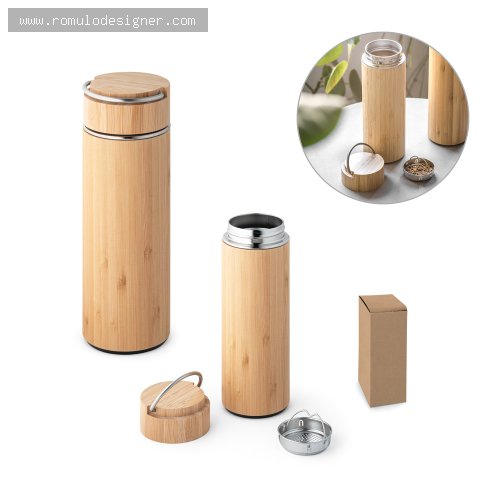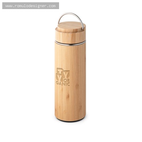 Garrafa em aço inox e bambu de parede dupla térmica, isolada a vácuo. Possui tampa com alça para fácil transporte e infusor em aço inox para chá. Capacidade até 440 mL. Preserva as bebidas quentes por 8h e as bebidas frias por 24h. Fornecida em caixa presente de papel kraft reciclado. Certificação EU Food Grade. A cor e o resultado da impressão nos materiais naturais pode variar entre produtos. ø70 x 215 mm .