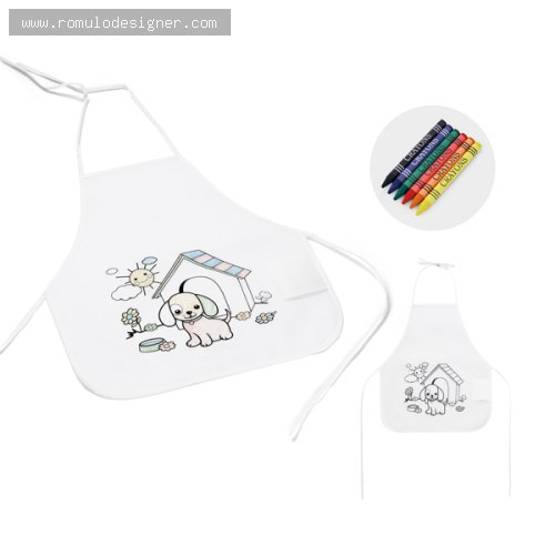 Avental de criança para colorir. Non-woven: 80 g/m². Com desenho impresso e bolso lateral. 6 gizes de cera inclusos.